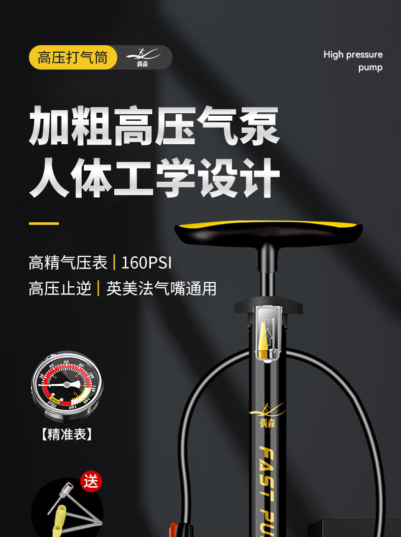 偶森高压打气筒自行车电瓶电动车汽车公路车篮足气球美英法嘴便携骑行充气泵